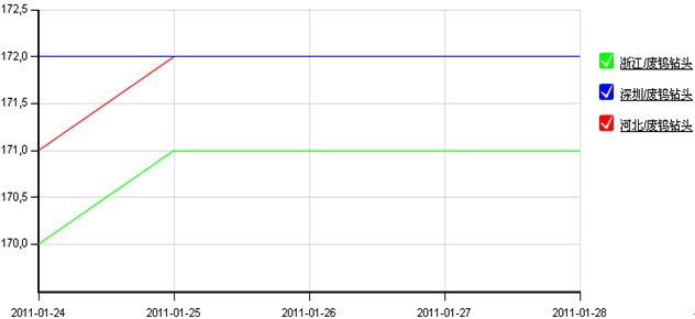 本周國內主要地區(qū)廢鎢鉆頭日均價格走勢圖如下圖所示: