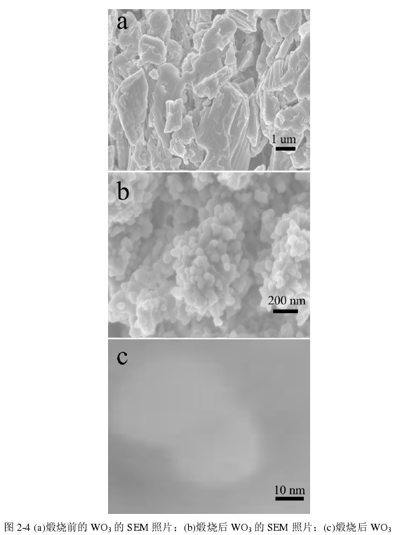以鎢酸鈉、氨水、聚乙烯醇等作為原料,按照一定的配比,超聲乳化,加入濃鹽酸得到黃鎢酸沉淀,在400、600和800攝氏度下恒溫八小時得到的WO3平均粒徑分別為15、25、85nm,WO3粉體均分散性較好,顆粒呈現(xiàn)規(guī)則的球狀結構,粒徑隨處理溫度的提高而長大。