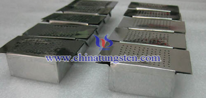 蒸鍍型鎢舟不同于其他類型的鎢舟的點在于該類型的鎢舟一般由鎢舟蓋和鎢舟本體組成,一般鎢舟蓋上設有蒸發圓孔,孔徑為1mm,孔間距可為2mm。鎢舟蓋上的蒸發孔既能有效防止原料濺出鎢舟,保證了成品質量,又節省了原料,還有利于材料的升華和蒸發,提高鍍膜效率。